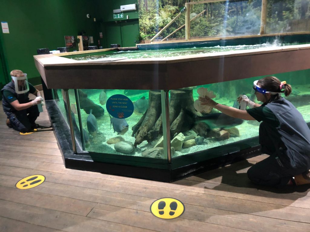 The aquarium is mostly mobility friendly, with the majority of exhibits located on one level and accessible routes available for wheelchair users and visitors with mobility aids. While some displays involve steps, these exhibits can also be viewed from accessible ground level viewing areas. Accessible toilet facilities are available onsite and include grab rails, a lowered wash basin and emergency pull cord. Guide dogs are welcome throughout the aquarium and restaurant.